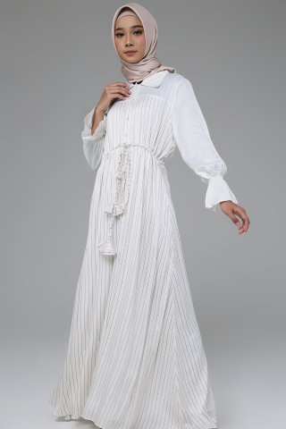 Hediye Dress merupakan produk gamis keren dari KNW by Kurnia Sari. Gamis ini terbuat dari bahan Velvet x Premium Silk Zara. Long dress ini memiliki sentuhan motif garis yang cantik dengan broken white. Padankan dengan jilbab berawarna cerah untuk penampilan yang lebih cerah. Ada aksen kerut di bagian pinggang sehingga berkesan unik dan kancing di bagian depan untuk mempermudah pemakaian. Kamu bisa membelinya seharga Rp 426.550 di Hijup.